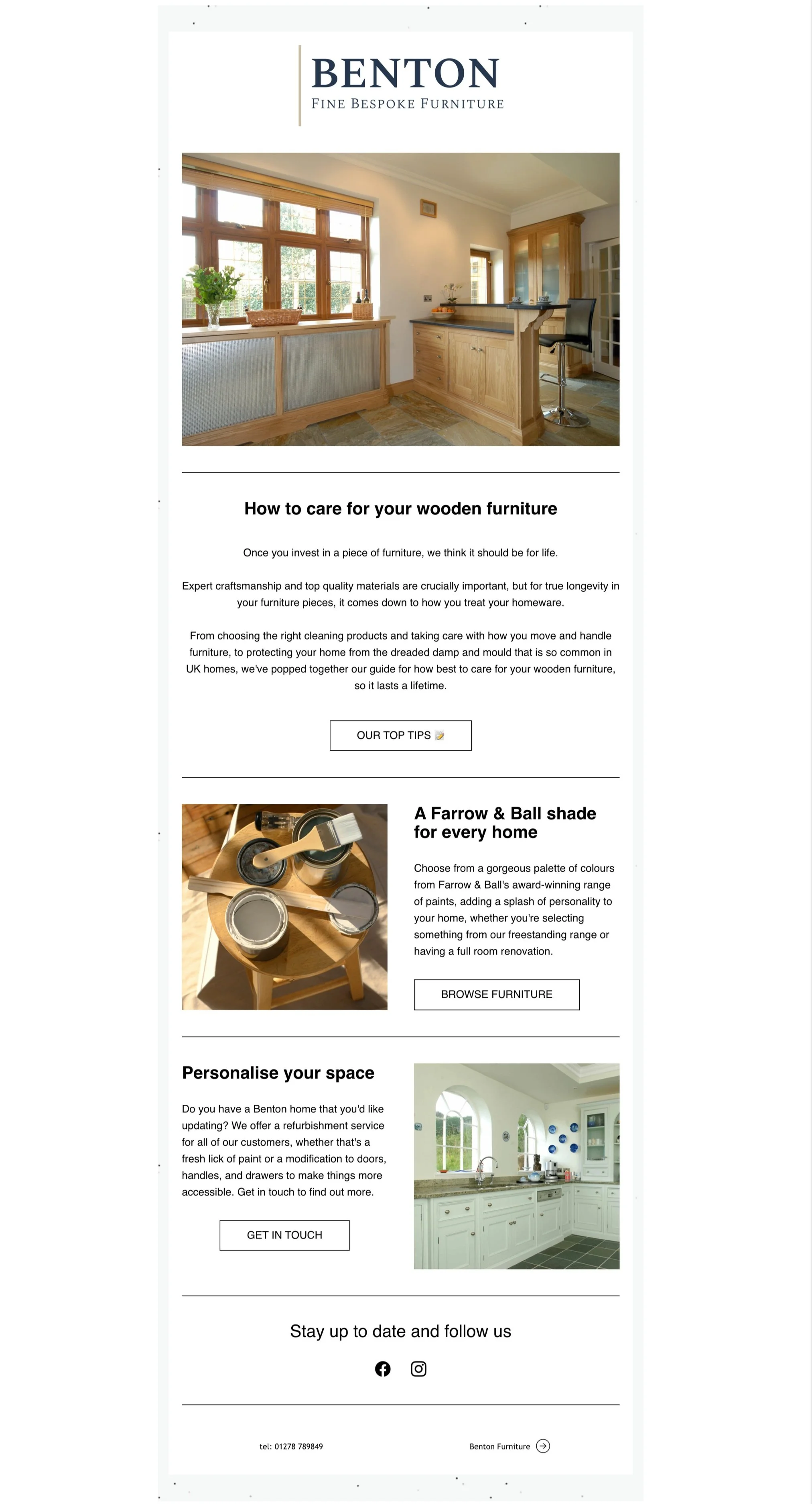 I now plan, write, and schedule all of Benton Furniture’s email marketing campaigns and blog posts. The company have seen a great ROI in this area each month, with increased open rates, click through rates, and enquiries that have led to four figure sales.