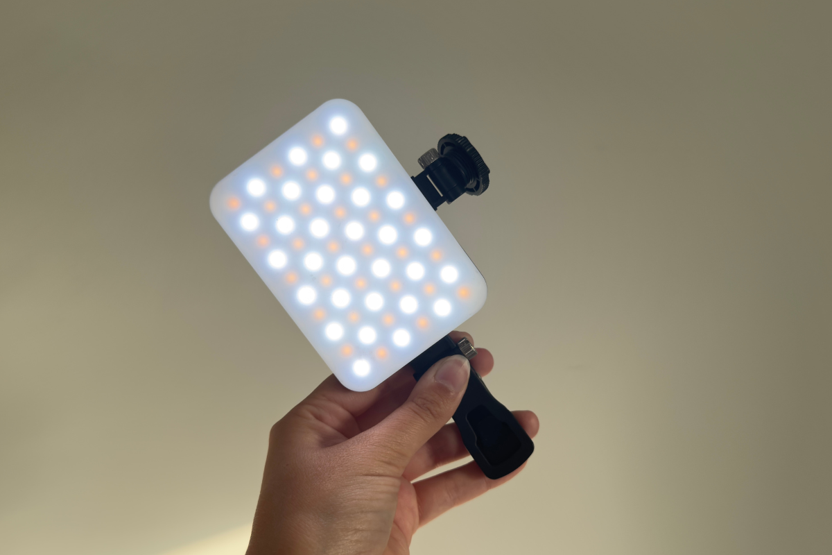 The ring light has three different light settings: cool, warm, or a bit of both, and the brightness level can also be turned up or down, meaning your light source moves with you when you’re filming.
